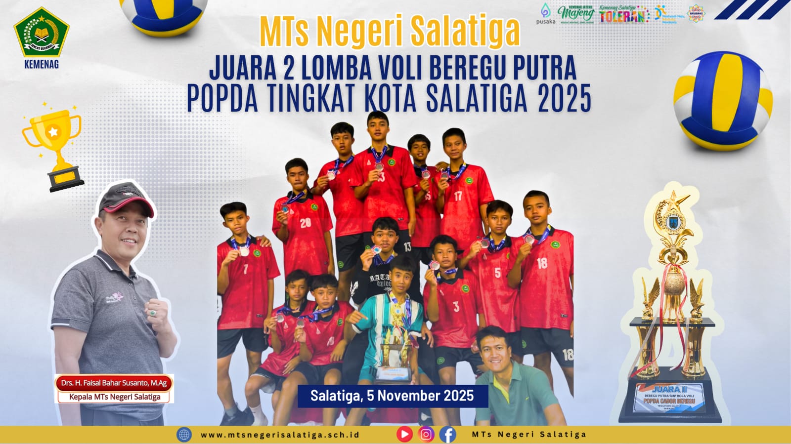 Salatiga, 5 November 2025 — Tim voli beregu putra MTs Negeri Salatiga kembali menorehkan prestasi gemilang dengan meraih Juara 2 dalam ajang Pekan Olahraga Pelajar Daerah (POPDA) Tingkat Kota Salatiga Tahun 2025.