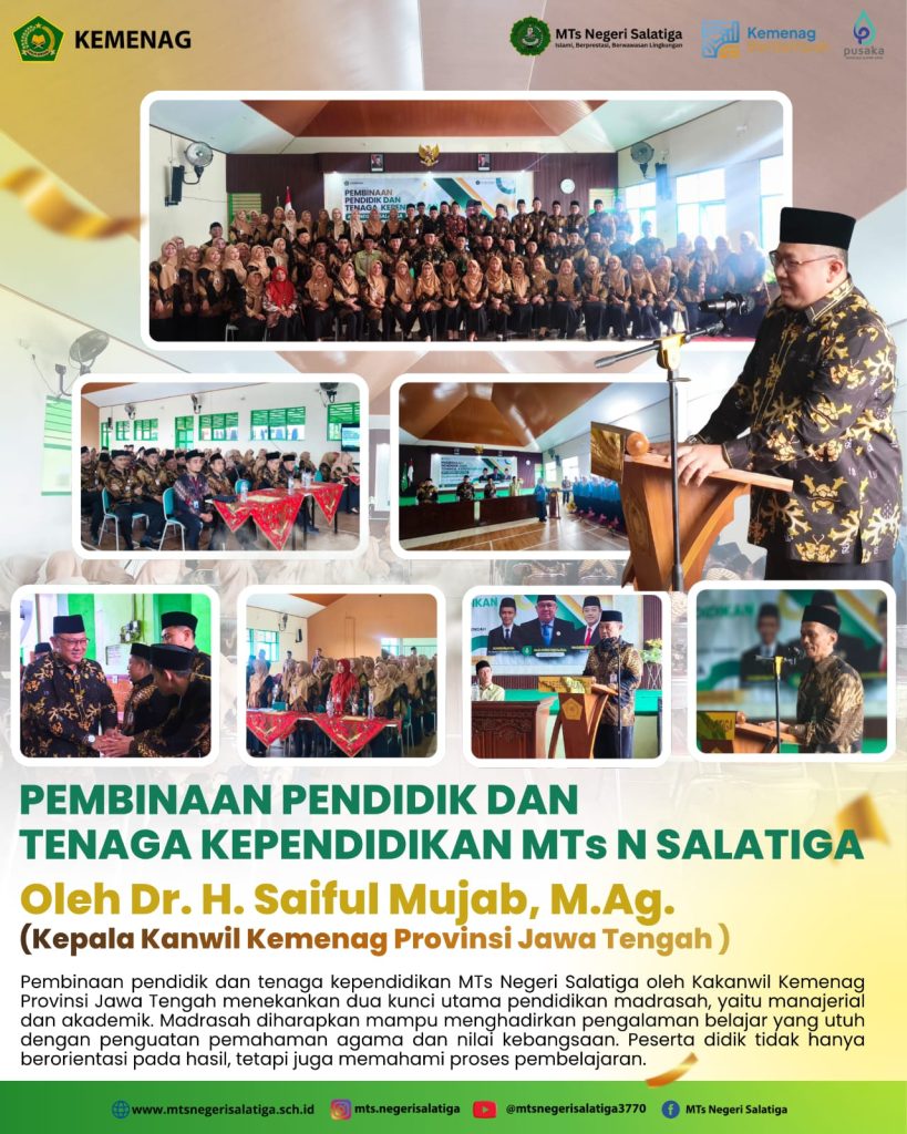Salatiga (MTs N Salatiga) – Madrasah Tsanawiyah Negeri (MTsN) Salatiga menyelenggarakan kegiatan pembinaan bagi pendidik dan tenaga kependidikan yang dipimpin oleh Kepala Kanwil Kementerian Agama Provinsi Jawa Tengah, Dr.H. Saiful Mujab, M.A., pada Kamis (2/2/2026) di aula madrasah. Kegiatan ini menjadi bagian dari upaya strategis dalam memperkuat kualitas sumber daya manusia guna mendukung peningkatan mutu layanan pendidikan.